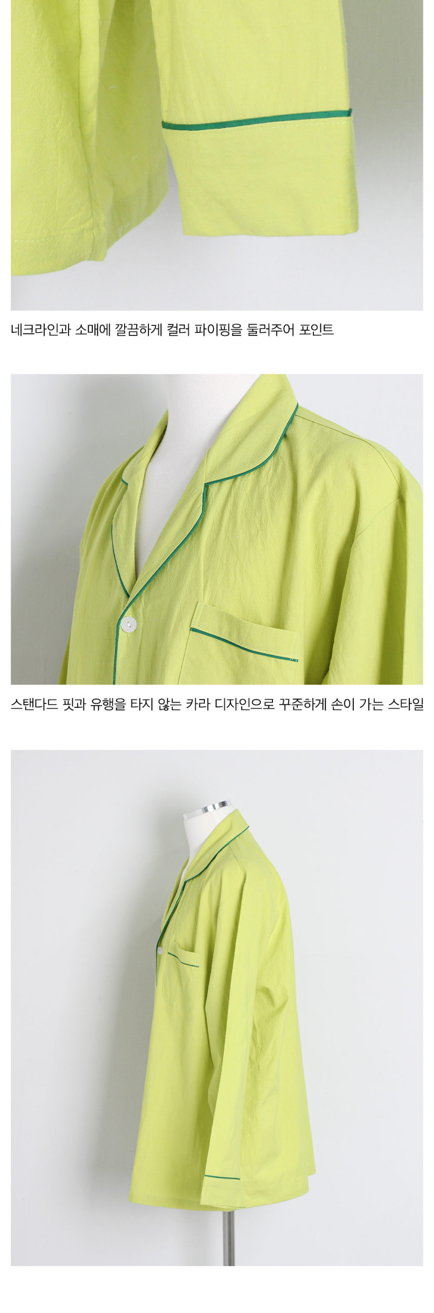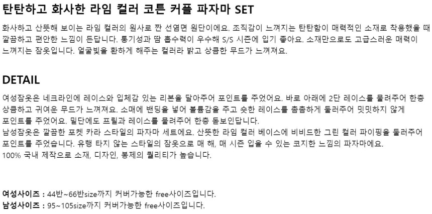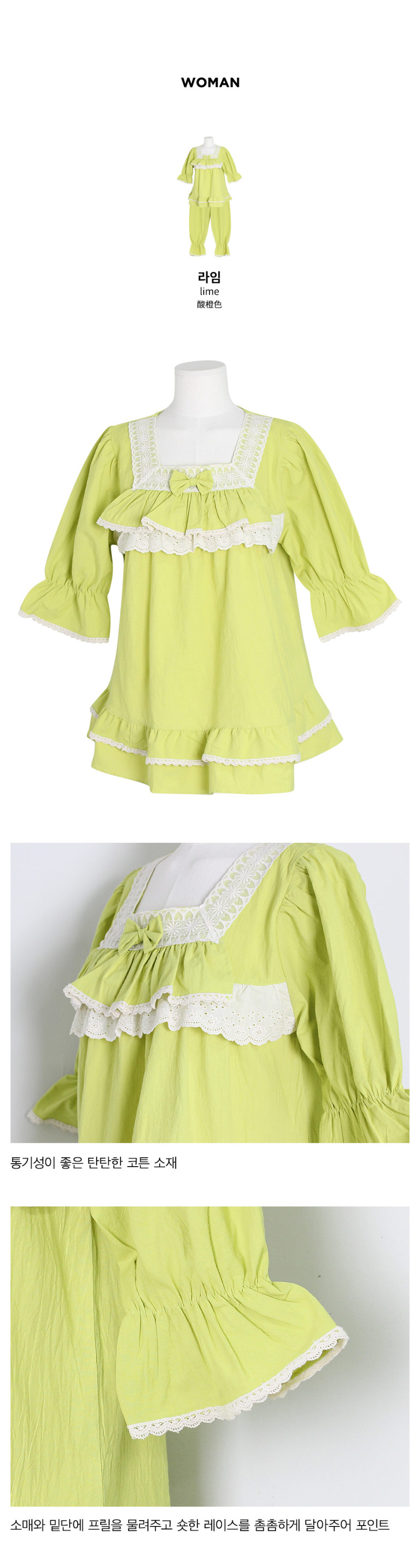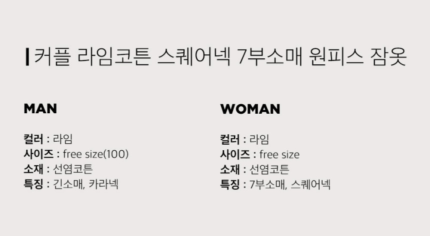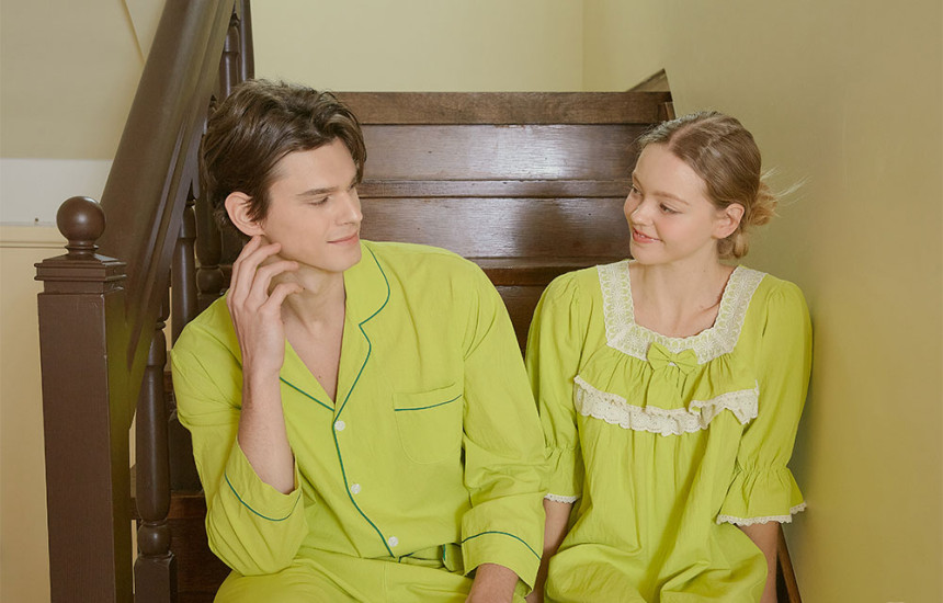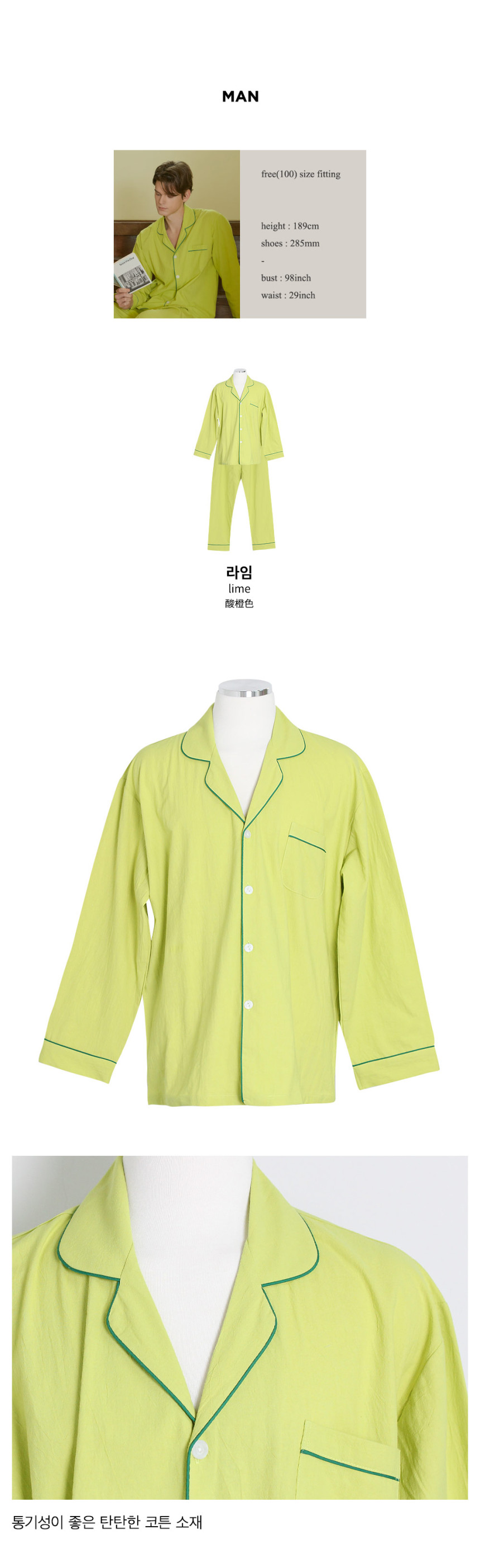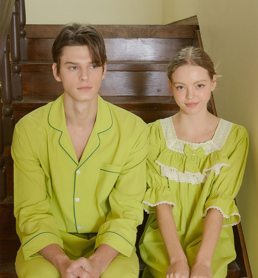 여성 남성 커플 라임코튼 긴소매 원피스 투피스 수면 잠옷