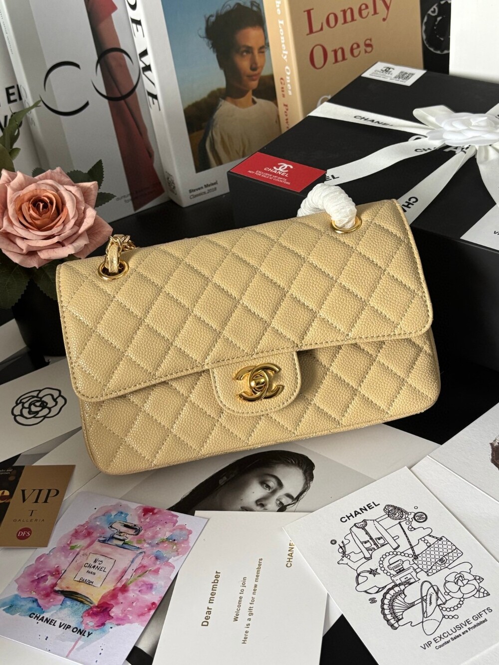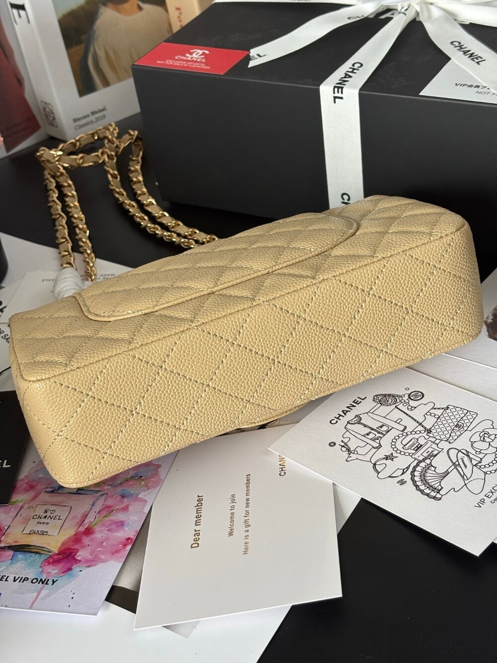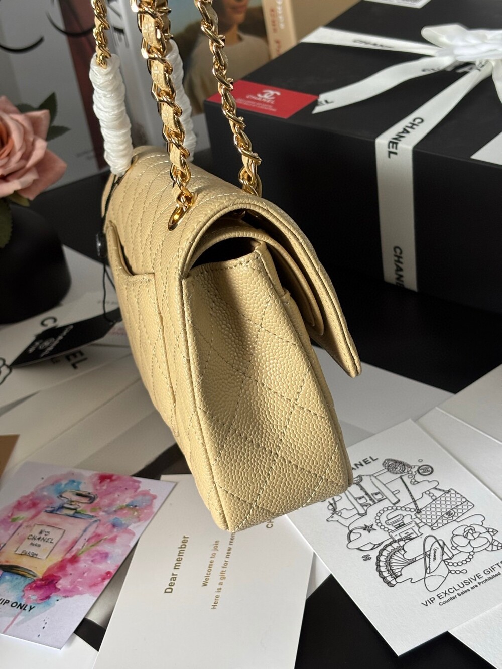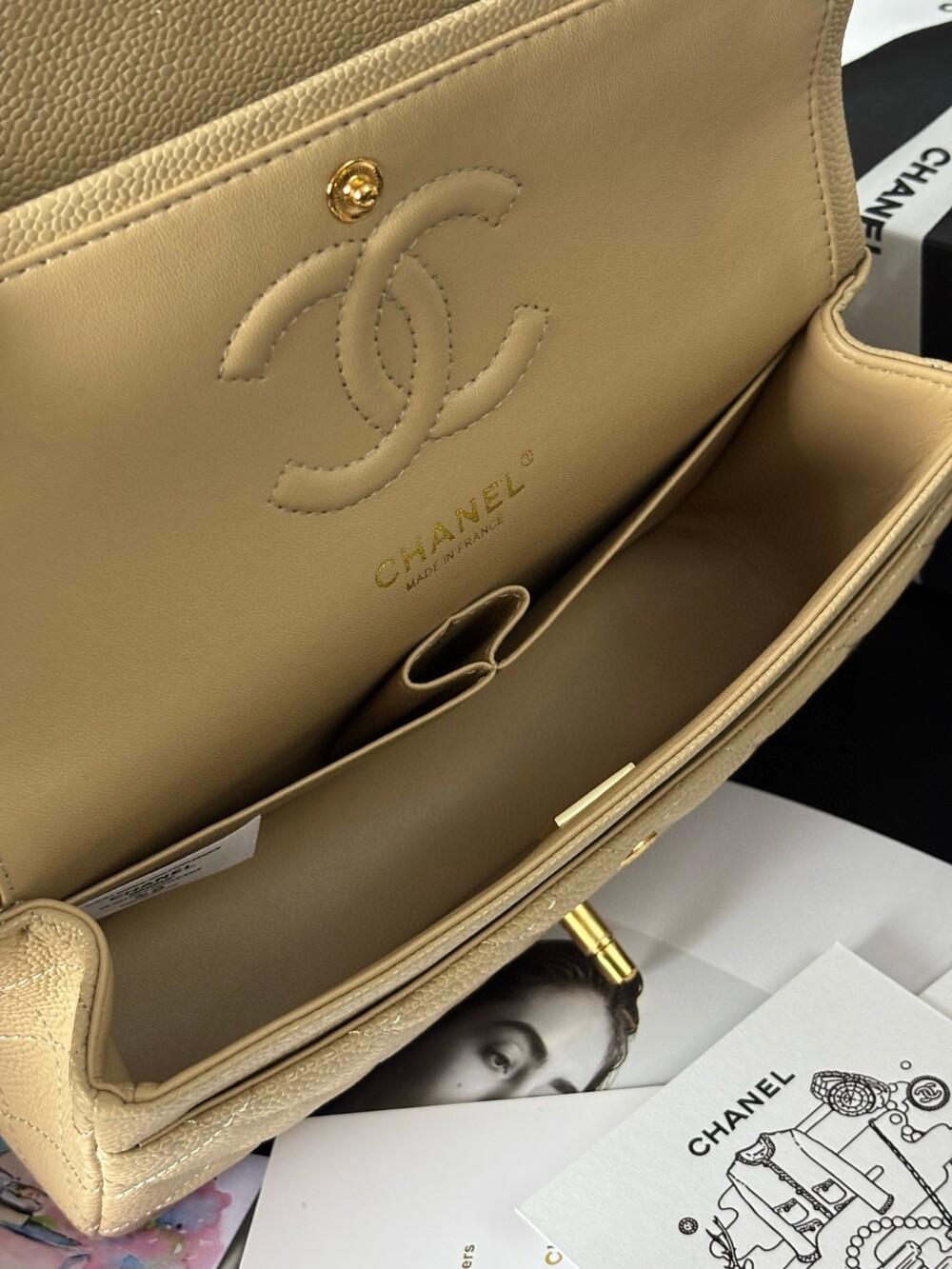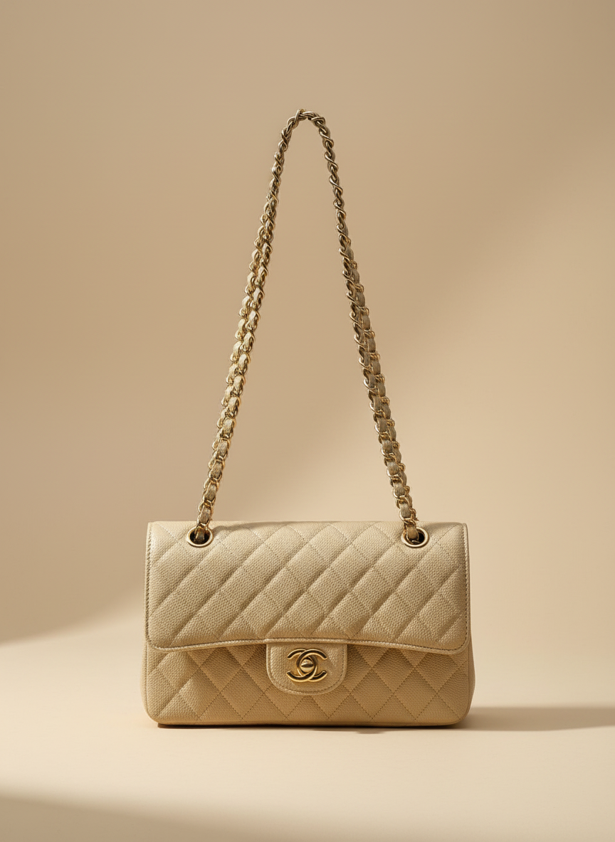 Flap Bag in soft beige caviar leather with signature gold hardware.