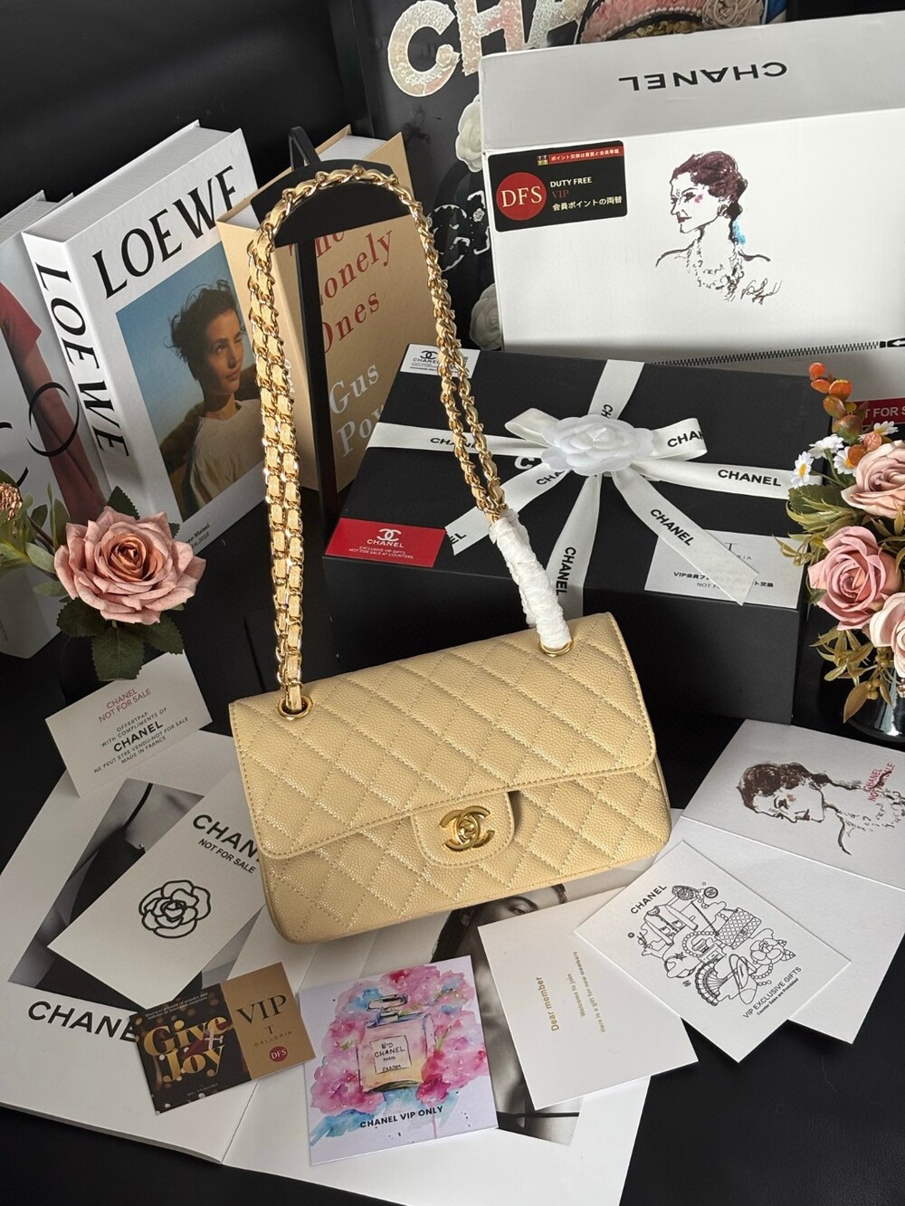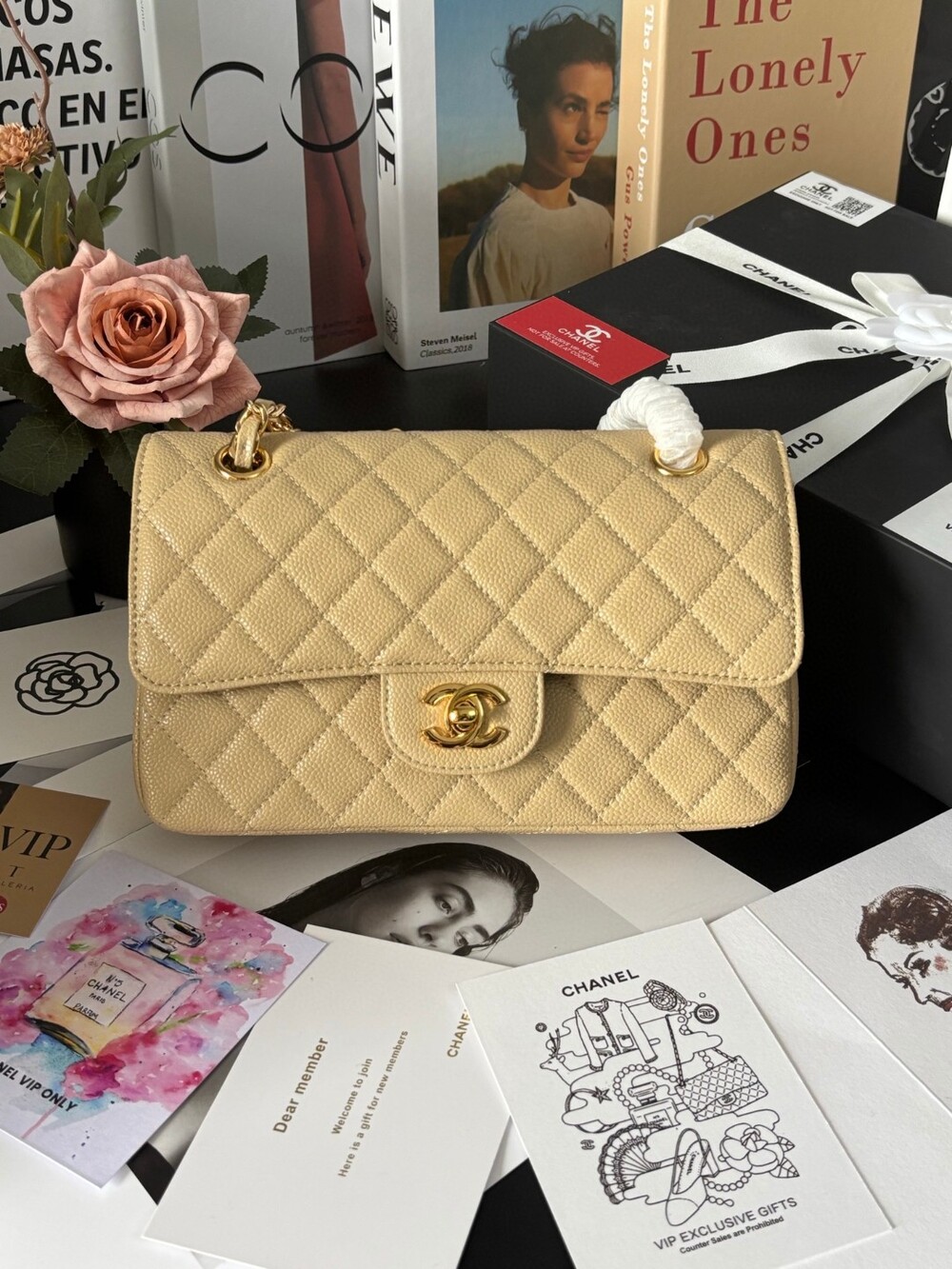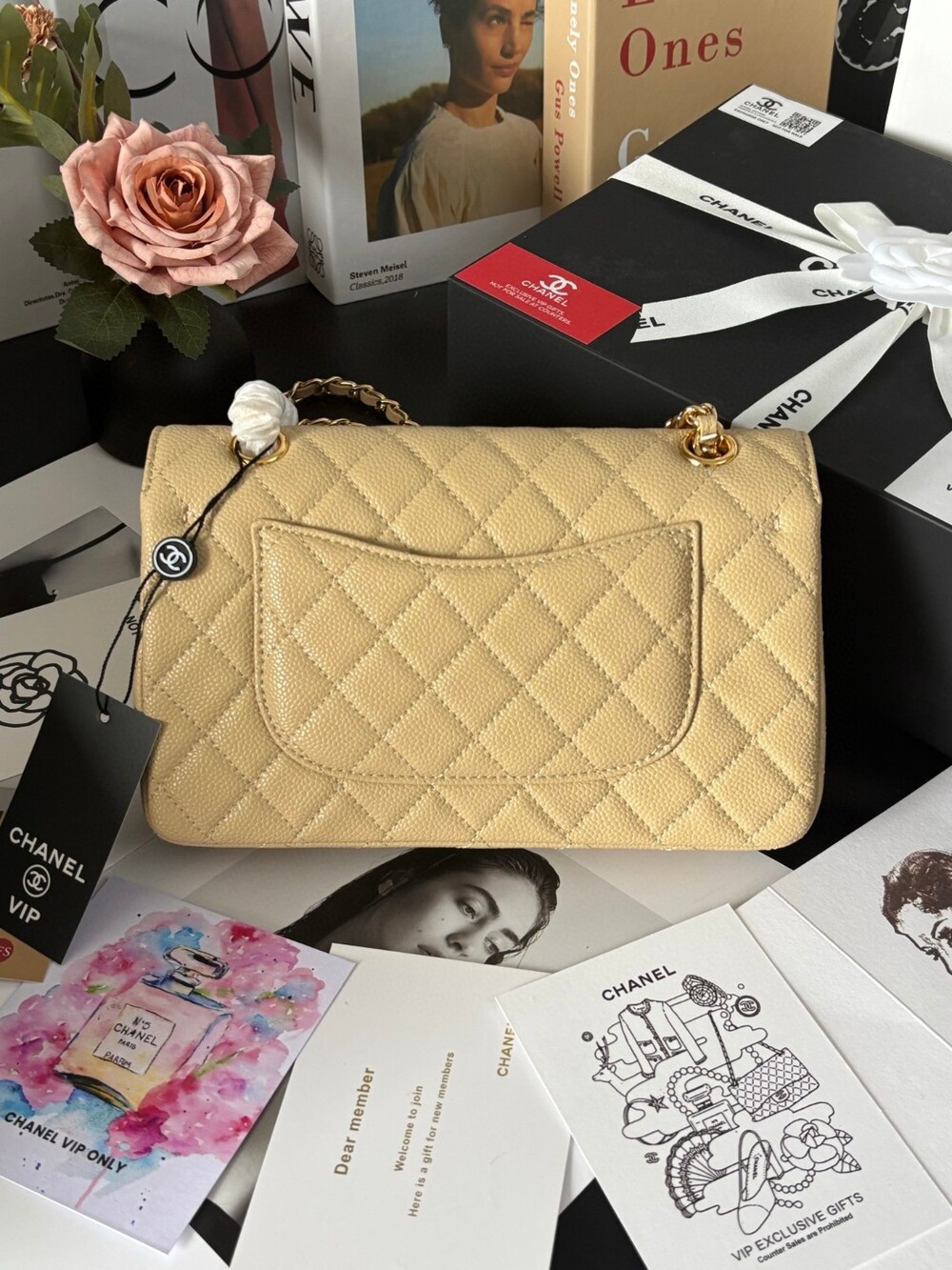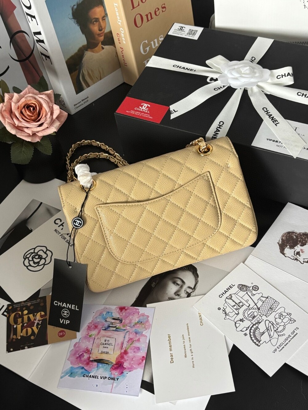 Flap Bag in soft beige caviar leather with signature gold hardware.