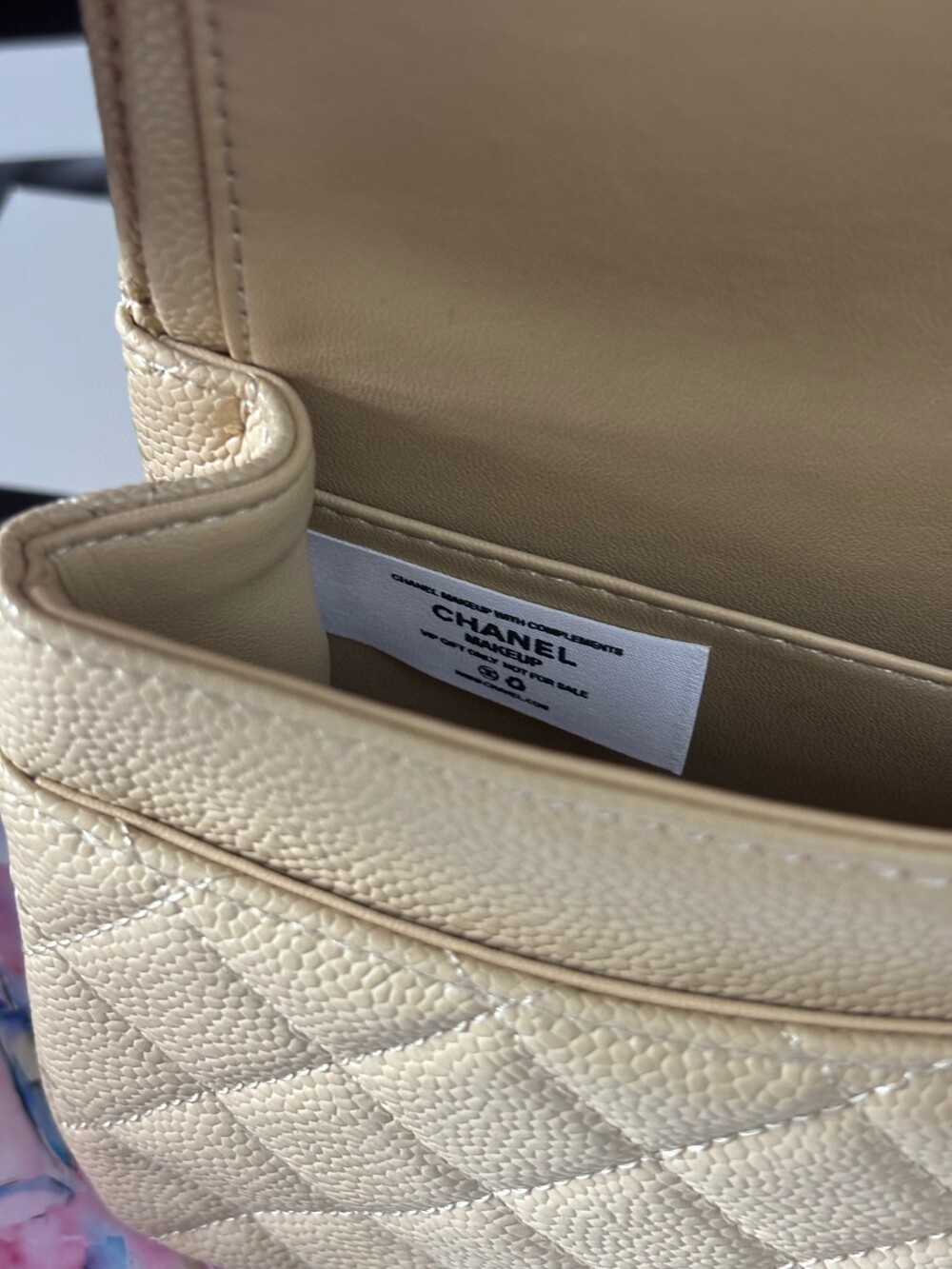 고급스러운 베이지 캐비어 가죽과 금장 하드웨어 조합으로,