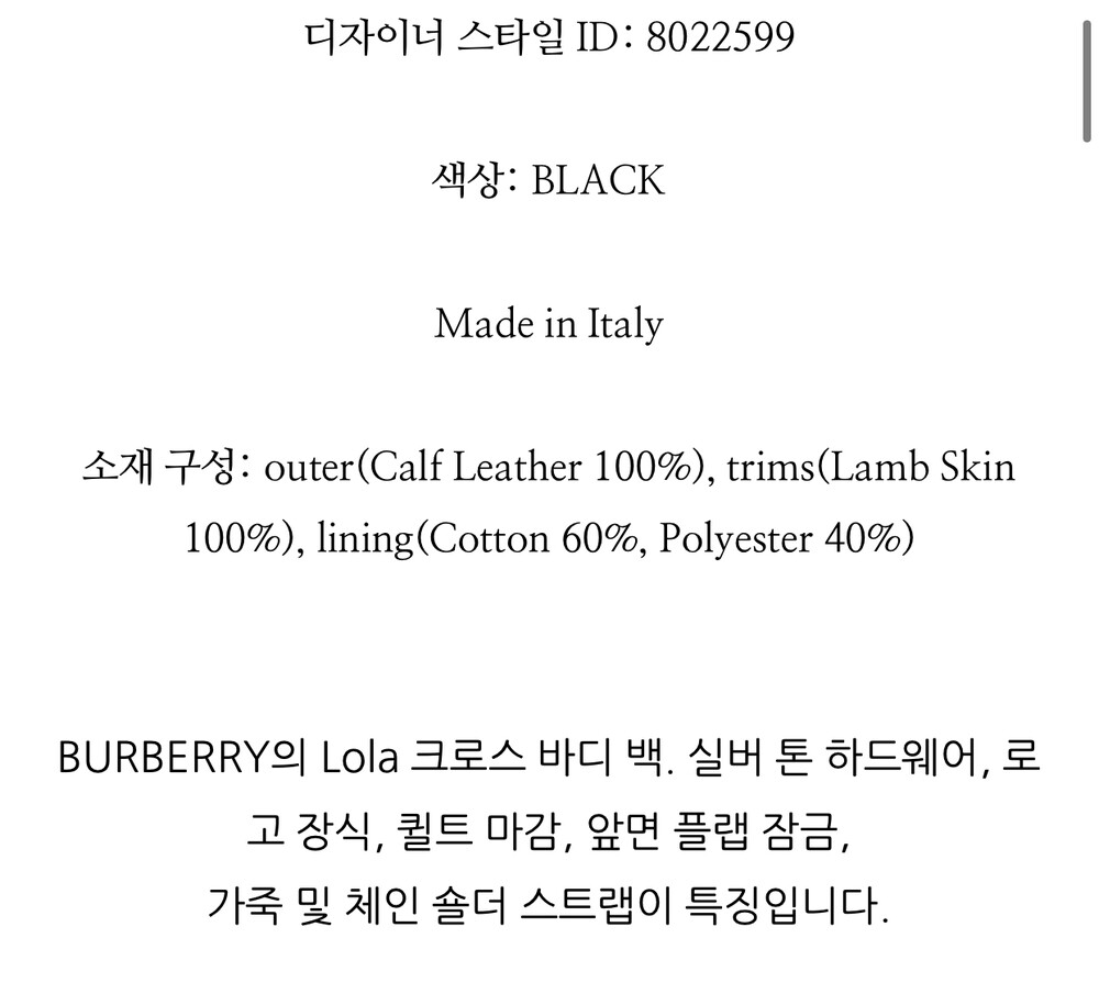 [정매장바잉] 버버리 퀼팅 롤라백 8022599 롤라 숄더백