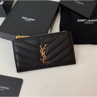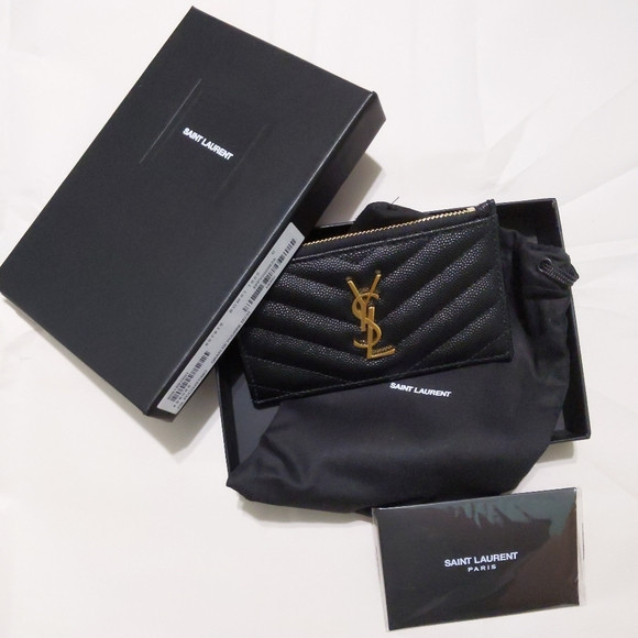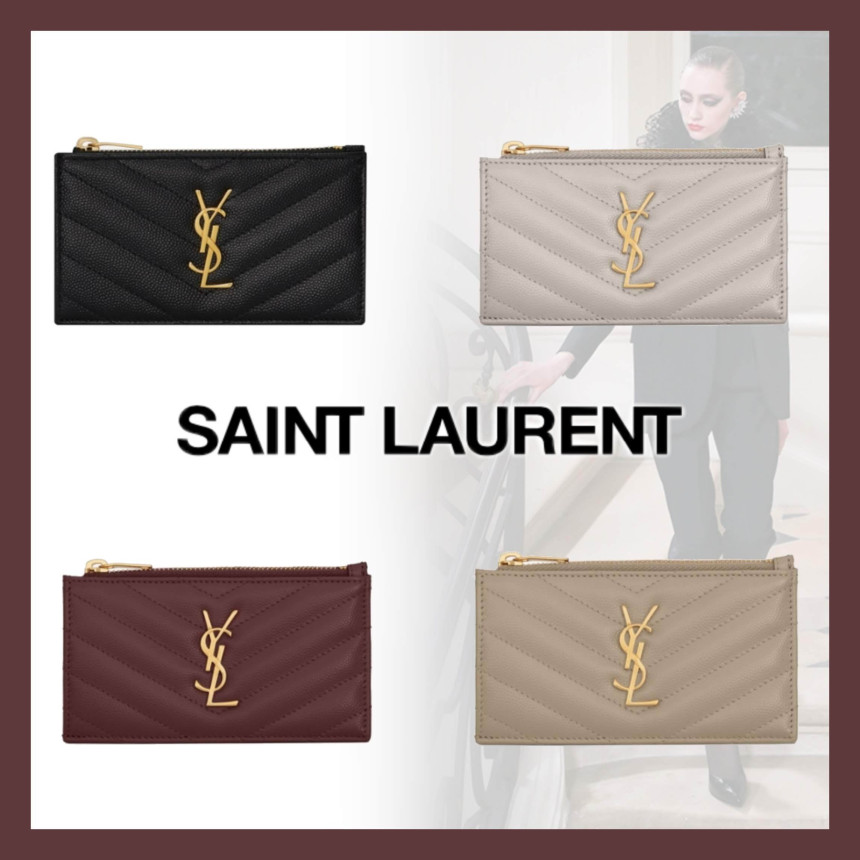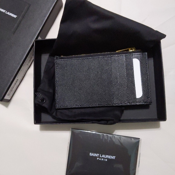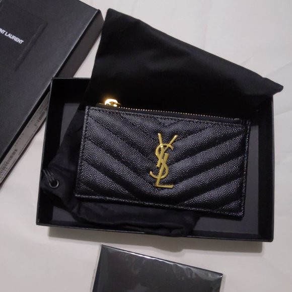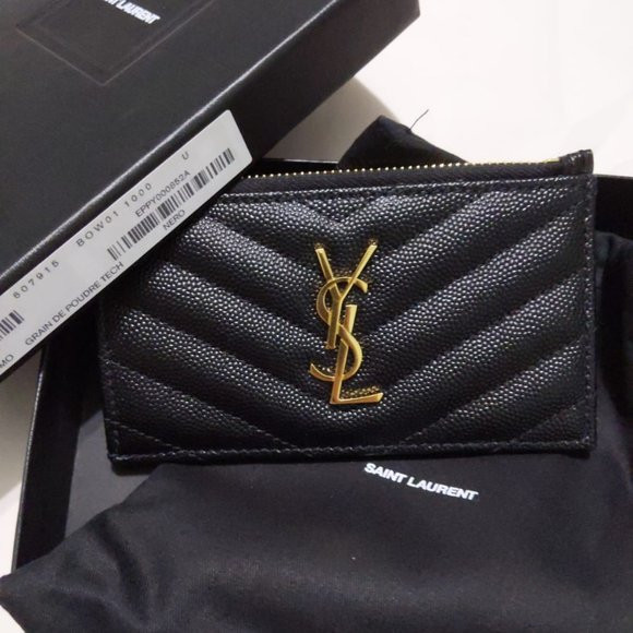 전면에 금속 YSL 이니셜이 있는 지퍼 케이스와 뒷면의 카드 슬롯.