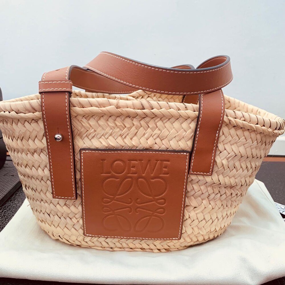 Embroidered logo on front, leather trim, raffia weave design. two round top handles, top clasp closure, internal zip pocket, internal logo patch