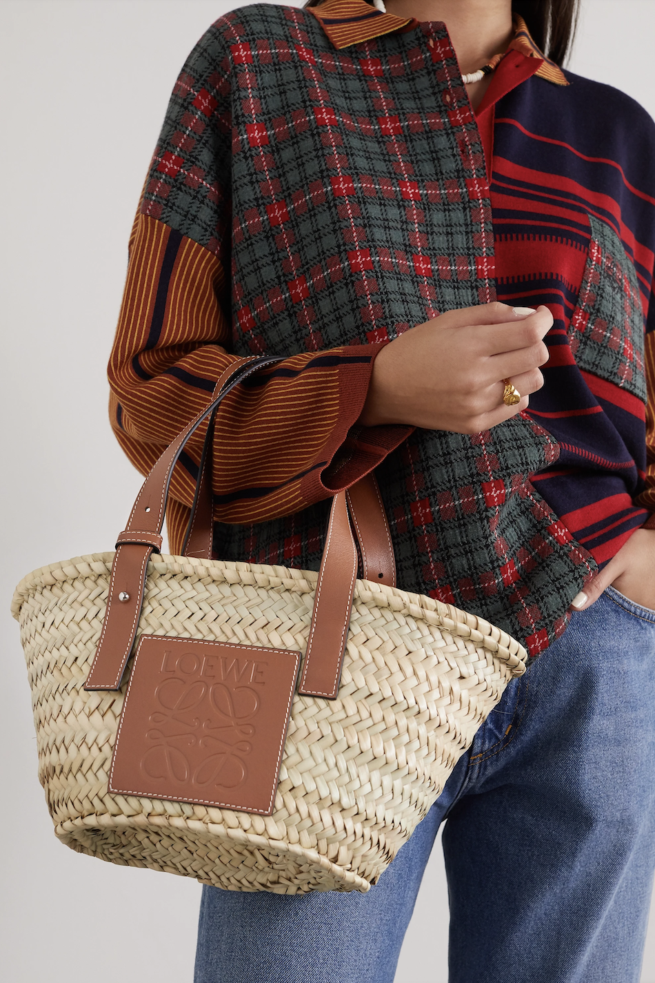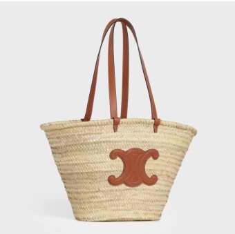 앞면의 자수 로고, 라피아를 엮어서 만든 디자인, 가죽 트리밍, 두 개의 라운드 탑 핸들, 윗면의 클래스프로 잠그는 형식, 내부의 지퍼 포켓, 내부의 로고 패치크기