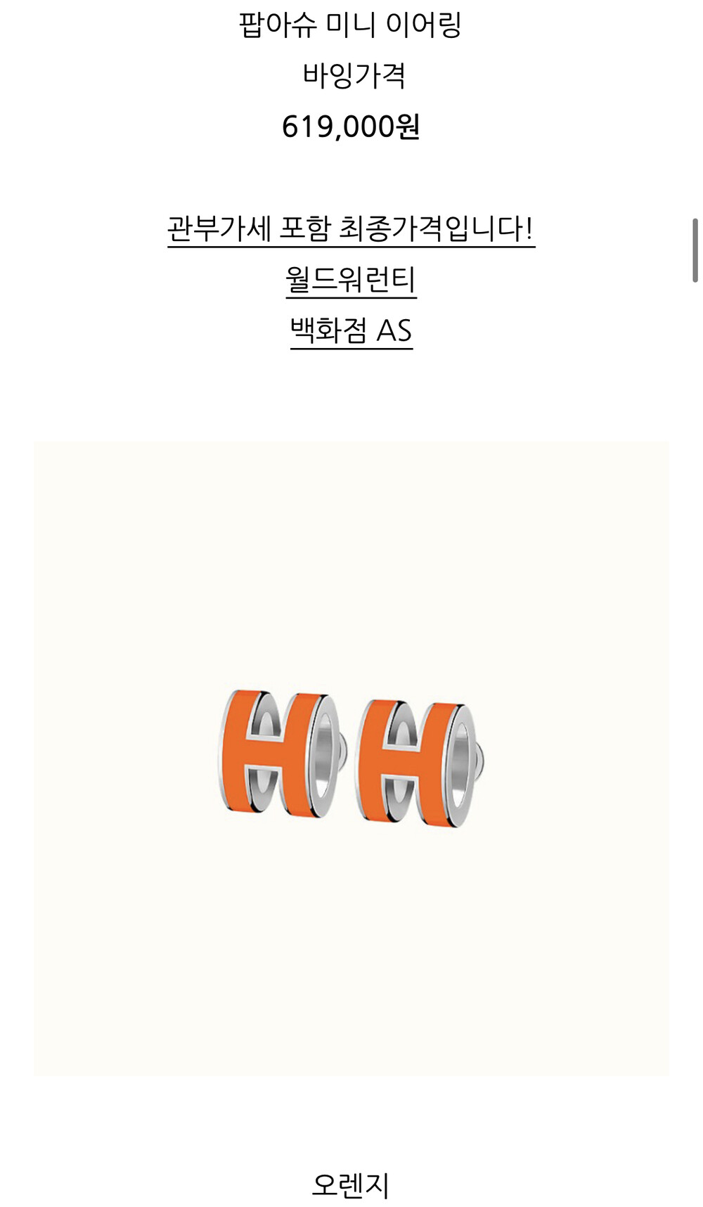 에르메스 전컬러 정매장바잉🧡 팝아슈 미니 이어링 팝 H 귀걸이