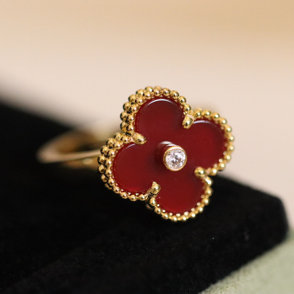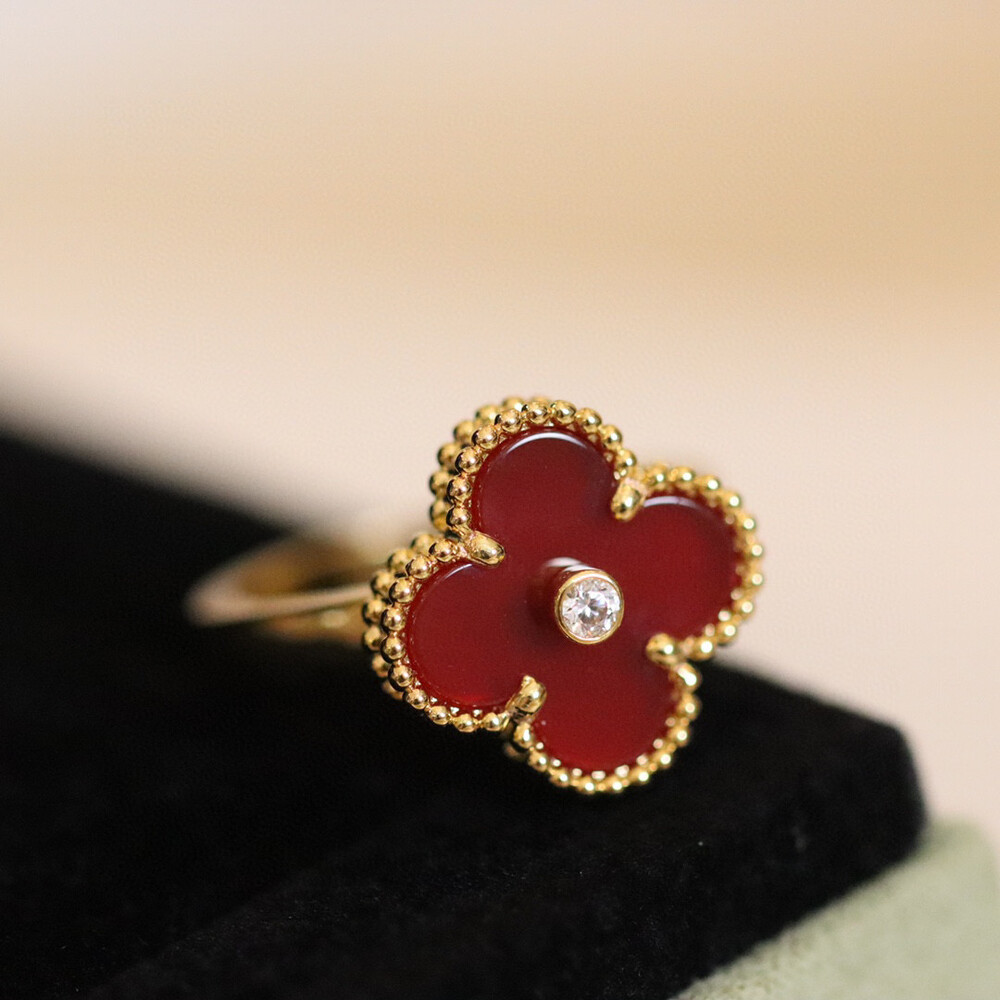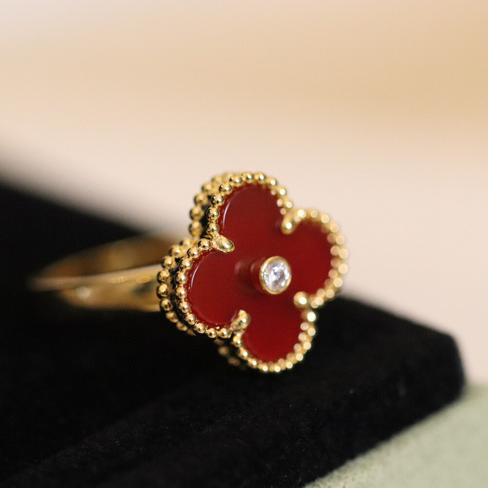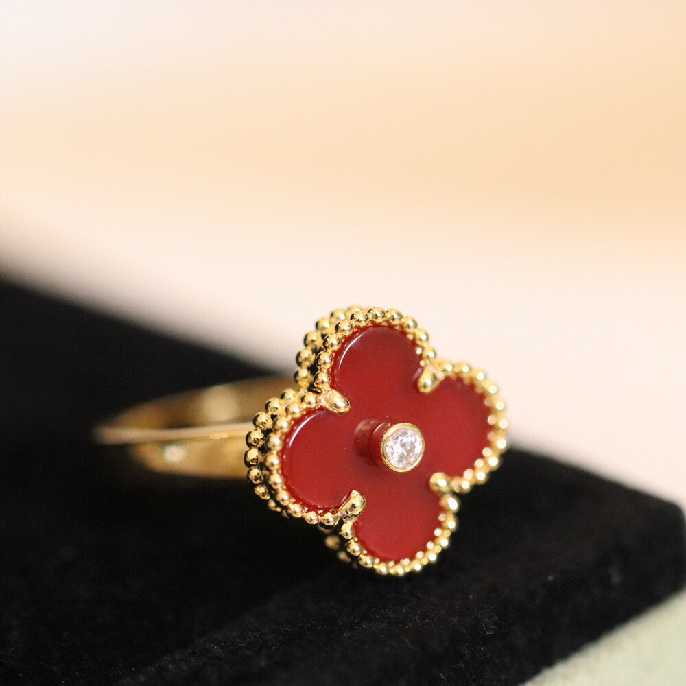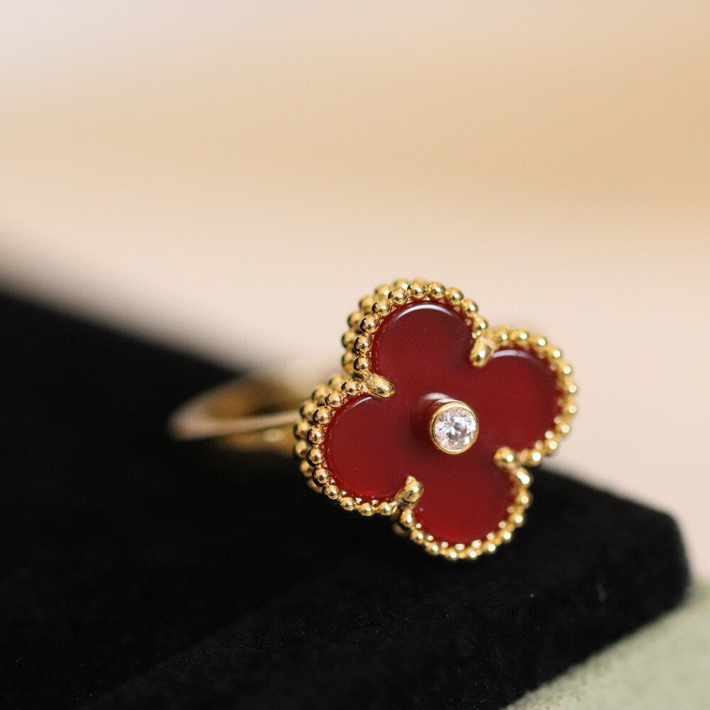 There is nothing more recommended than the four-leaf clover ring💍 Its unique design, timeless and elegant, teaches people to fall in love at first sight. The lucky symbol draws inspiration from the four-leaf lucky pattern and is decorated with yellow gold round beads and carnelian. Natural 7-point simulation diamonds One word "beauty"