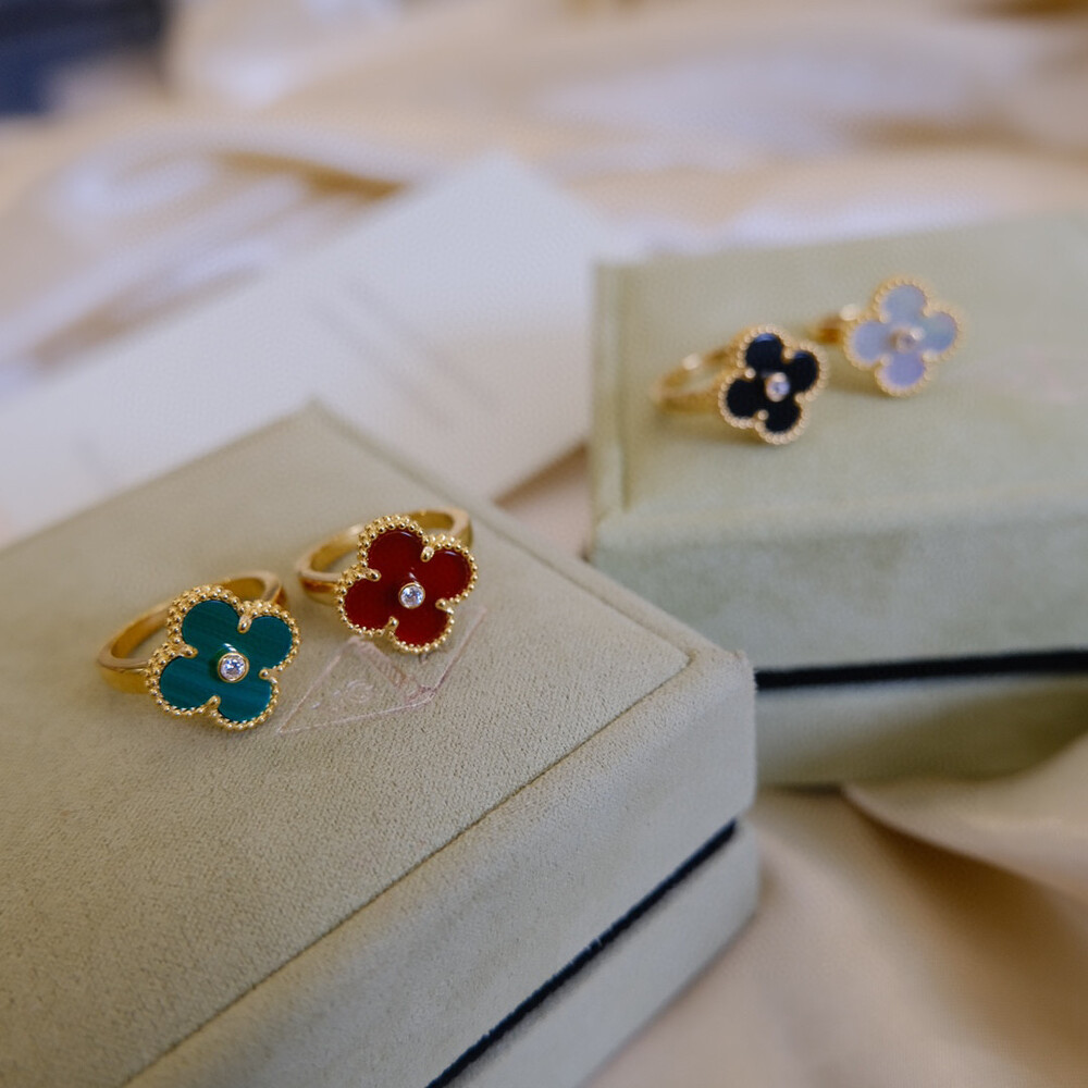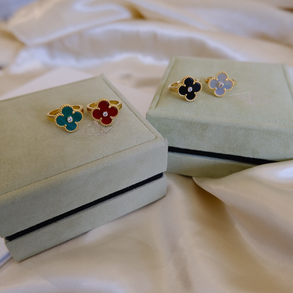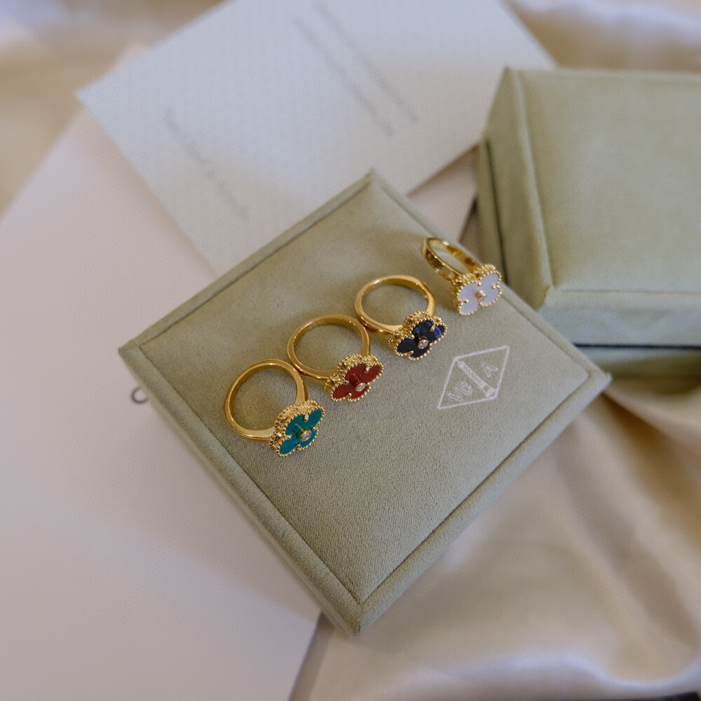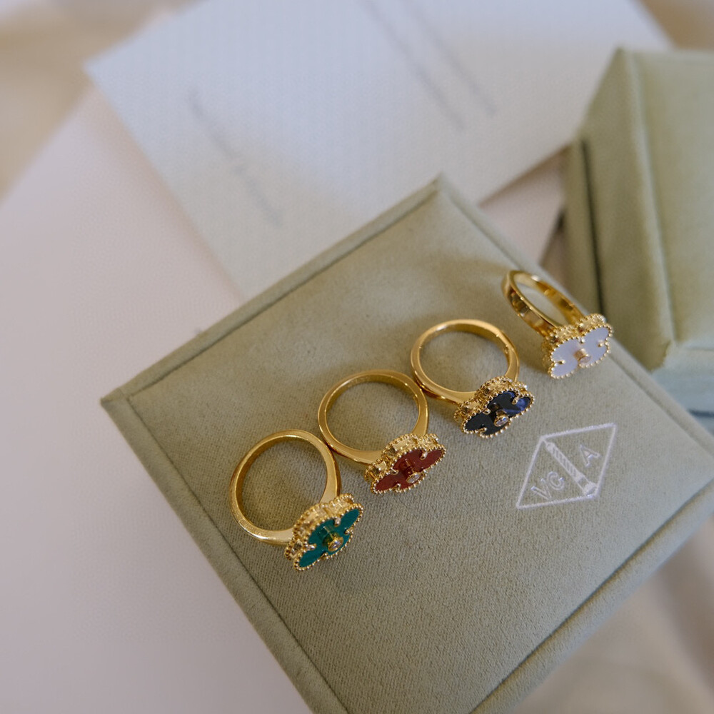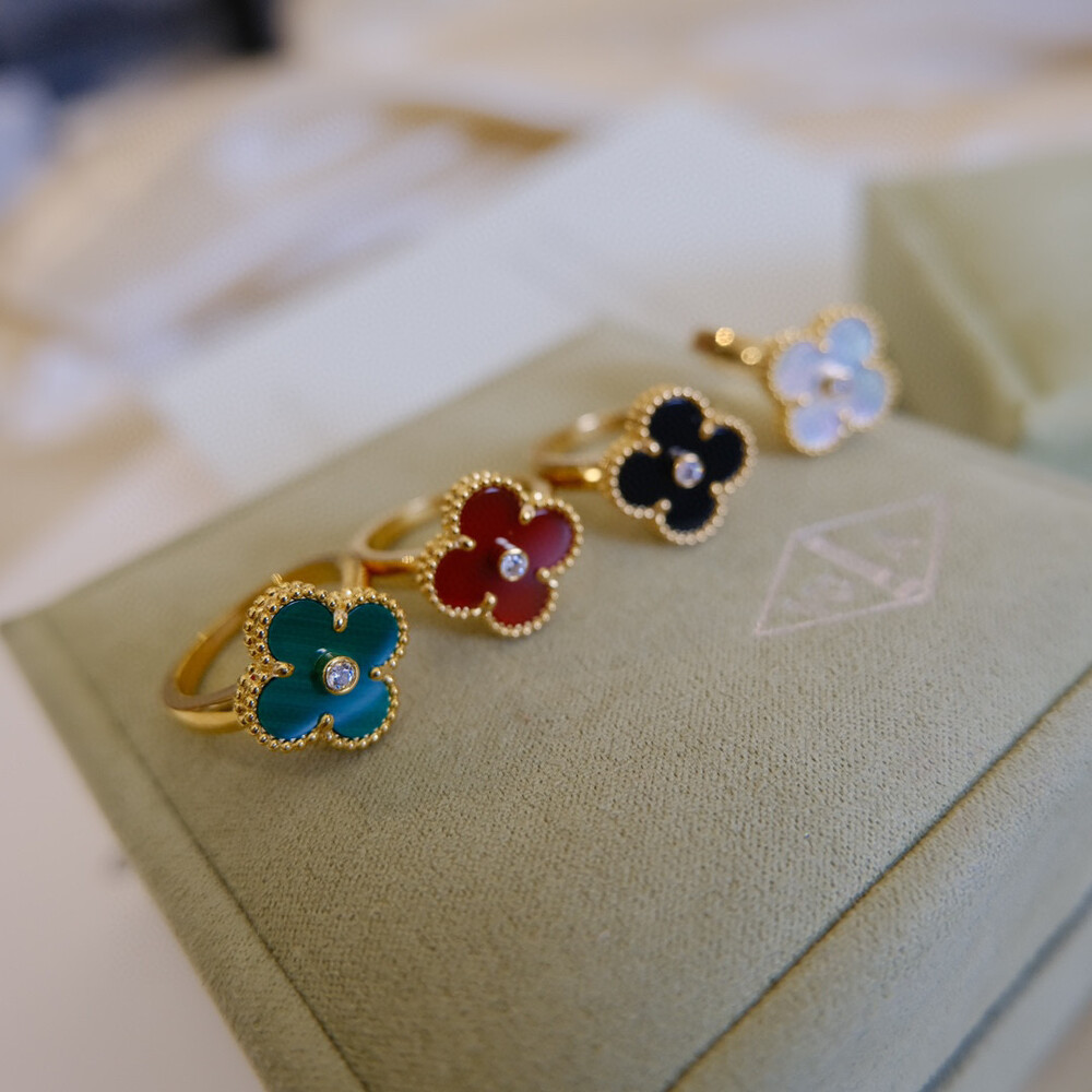 There is nothing more recommended than the four-leaf clover ring💍 Its unique design, timeless and elegant, teaches people to fall in love at first sight. The lucky symbol draws inspiration from the four-leaf lucky pattern and is decorated with yellow gold round beads and carnelian. Natural 7-point simulation diamonds One word "beauty"